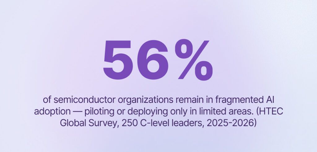 AI chips are now 0.2% of all chips manufactured, but they account for roughly 50% of total industry revenue1. This ratio reflects current semiconductor trends. AI is already reshaping chip design cycles, manufacturing yield optimization, and deployment architectures. Yet according to HTEC’s global survey of 250 C-level semiconductor leaders, only 44% of organizations have fully embedded AI across multiple functions, while the remaining 56% are still operating in pilots, limited deployments, or early exploration. The enterprise-wide AI integration is not yet in place. Based on insights from the survey and expert commentary from Craig Melrose and Ian Baird, senior semiconductor leaders at HTEC, several trends are set to define the semiconductor landscape in 2026.