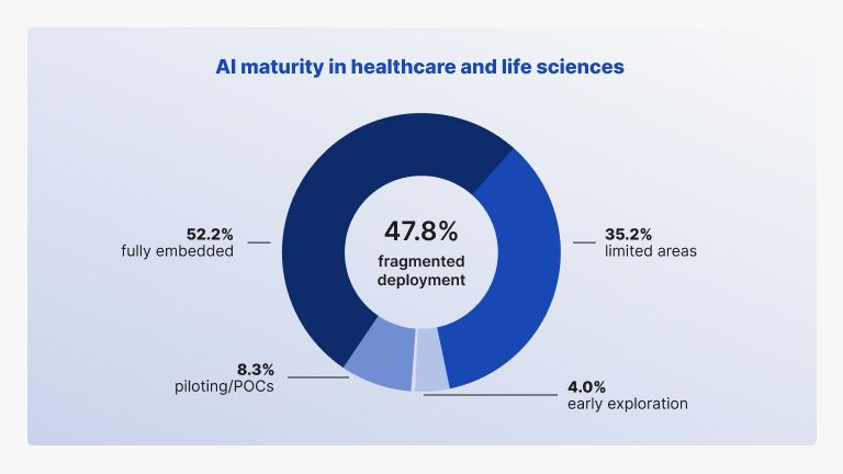 AI adoption in healthcare and life sciences is widespread. Still, close to a half of organizations remain in fragmented stages of adoption, relying on limited deployments, pilots, or isolated use cases.