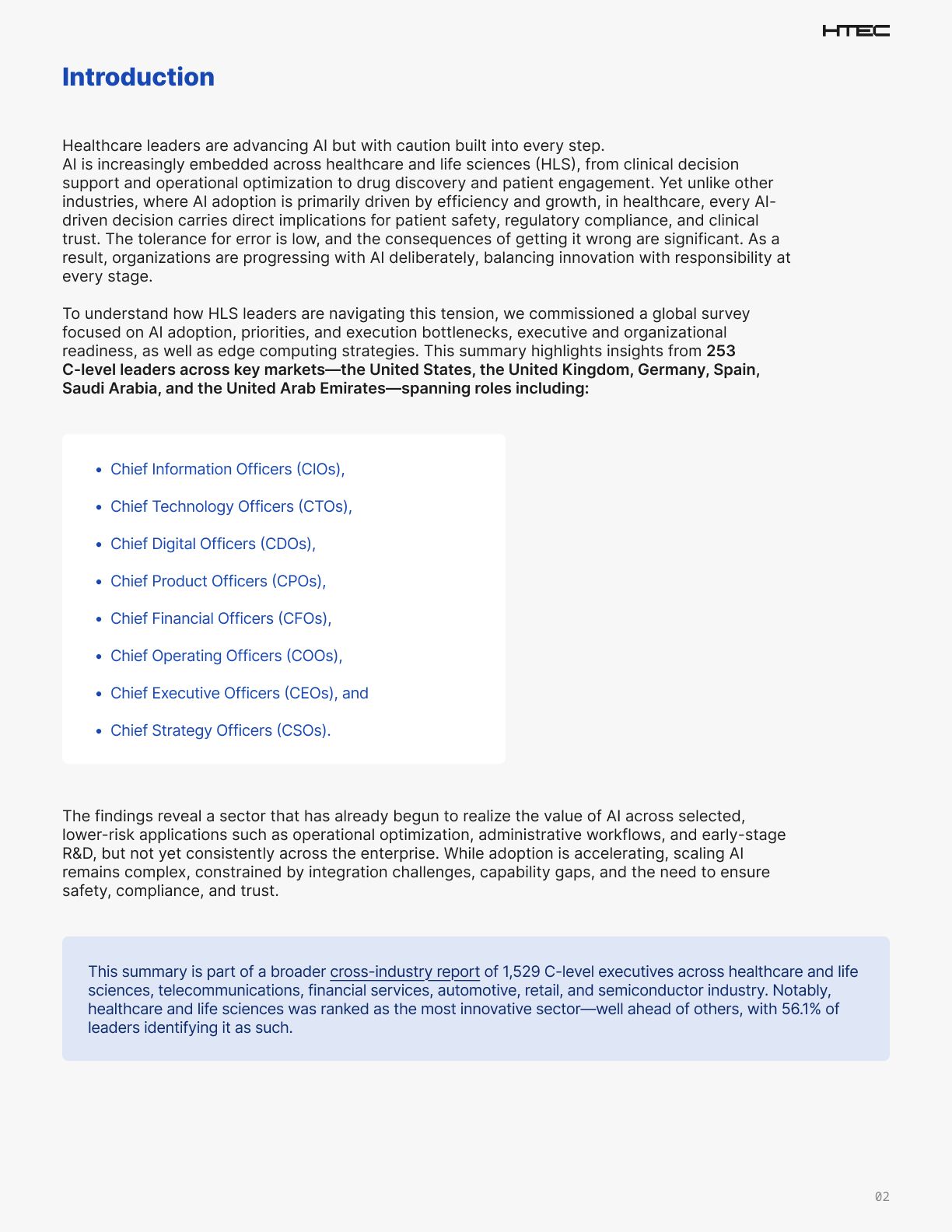 The report was commissioned by HTEC and conducted by Censuswide. It includes insights from 253 C-level healthcare and life sciences executives, gathered as part of broader cross-industry research into the perspectives of 1,529 C-suite executives across the USA, UK, Germany, Spain, Saudi Arabia, and the UAE, spanning CEO, CIO, CTO, CDO, CFO, COO, CPO, and CSO roles.