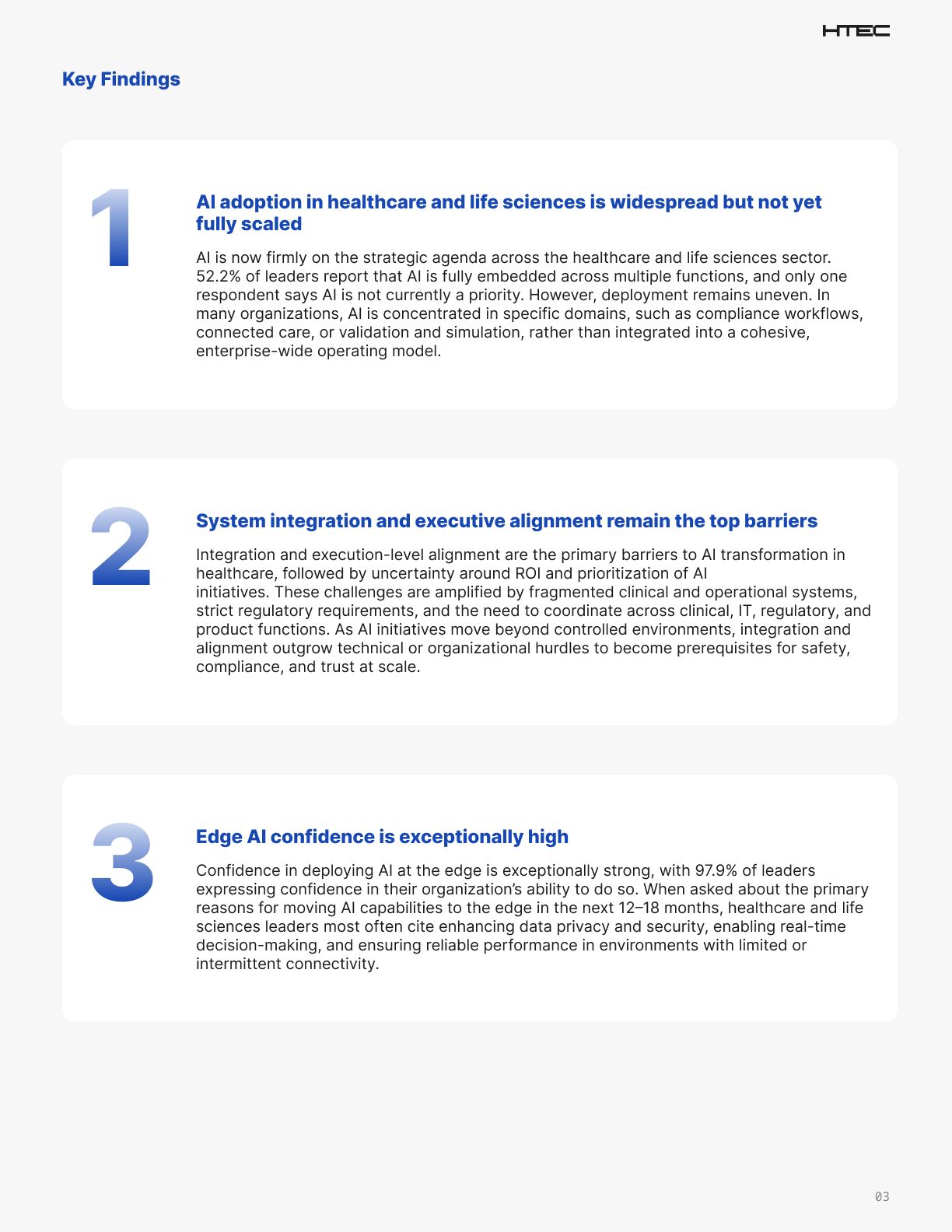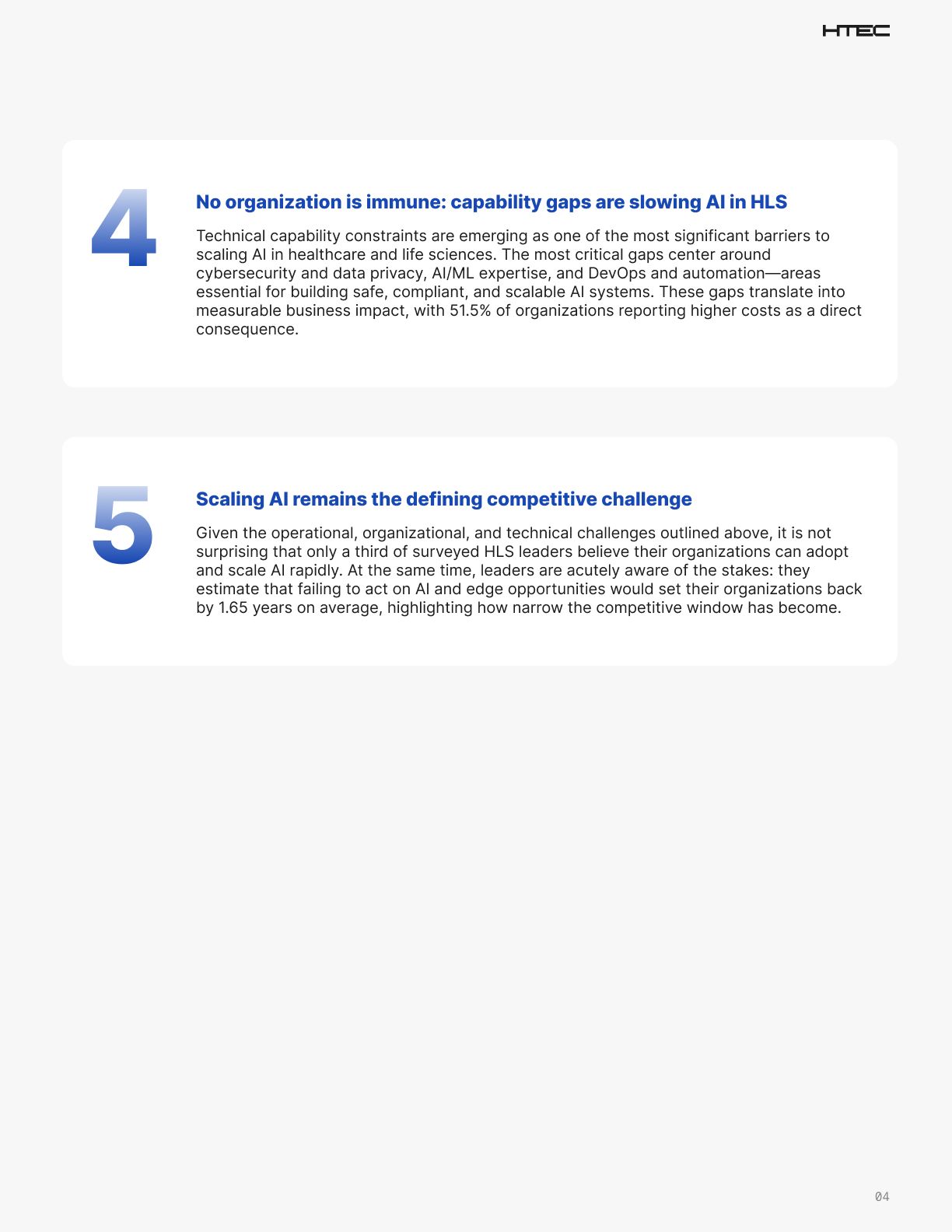 Our experience with healthcare and life sciences clients at HTEC reflects these findings. Organizations are making real progress in areas such as AI-driven compliance, connected and remote care, simulation and validation, and treatment optimization. But the next challenge is turning those targeted advances into repeatable, organization-level value across highly regulated and operationally complex environments.